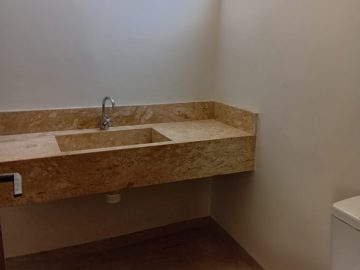 Banheiros reformados com porcelanatos e cubas em mármores, guarda roupa embutido, ventiladores de teto, janelas em blindex.